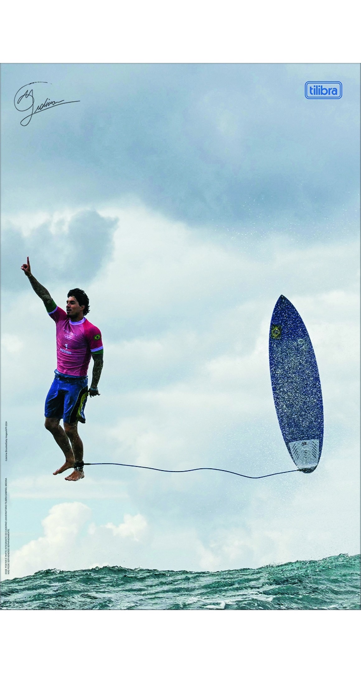 O caderno universitário Gabriel Medina da Tilibra também vem com um pôster autografado da foto que viralizou e se tornou uma das principais imagens das Olimpíadas de Paris, na França.